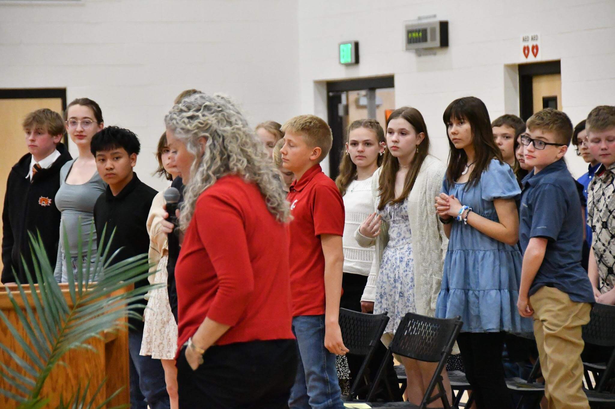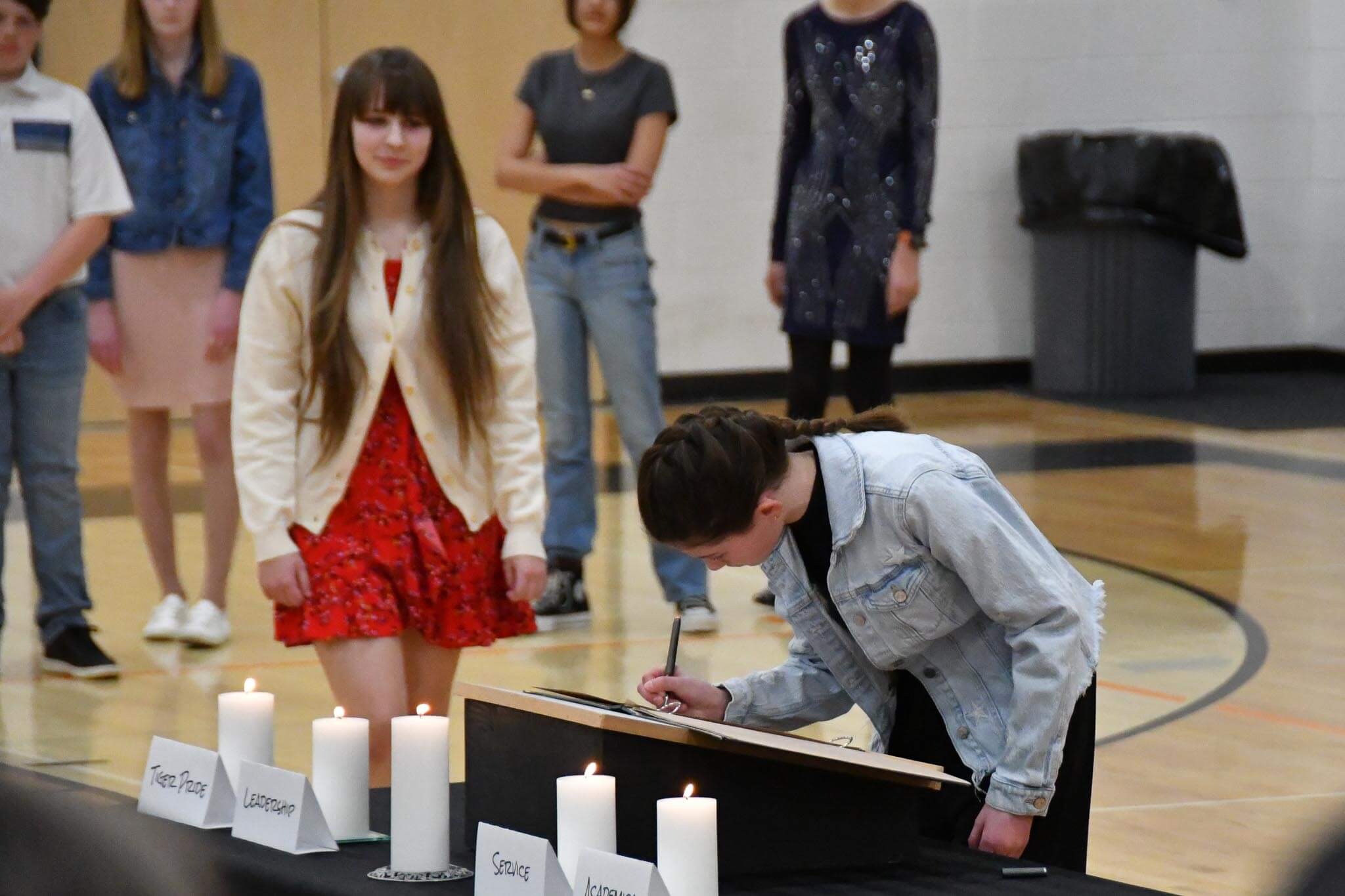 Twenty-nine seventh graders and five eighth graders were inducted: Anderson Bair, Elyse Bair, Nicole Bair, Mabel Chamberlin, Izzy Darby, Ali Dorton, Jess Engle, William Firl, Audrey Iverson, SE Jay, Caden Johnson, Keair Judkins, Miles Kask Barberi, Paisley LaJueness, James Marquina, Kaleo McWilliams, Brooklen Minnick, Kayleigh Moore, Kendall Moore, Matthew Morris, Maxine Rashford, Gemma Rushton, Nora Sackmann, Mylee Shannon, Cash Sieverkropp, Kate Stadelman, Jordan Yurian and Lilliana Zaets, Korben Fronsman, CJ Kok, Alex Licup, Emily Moore, Abel Palafox and Roan Wiser.
