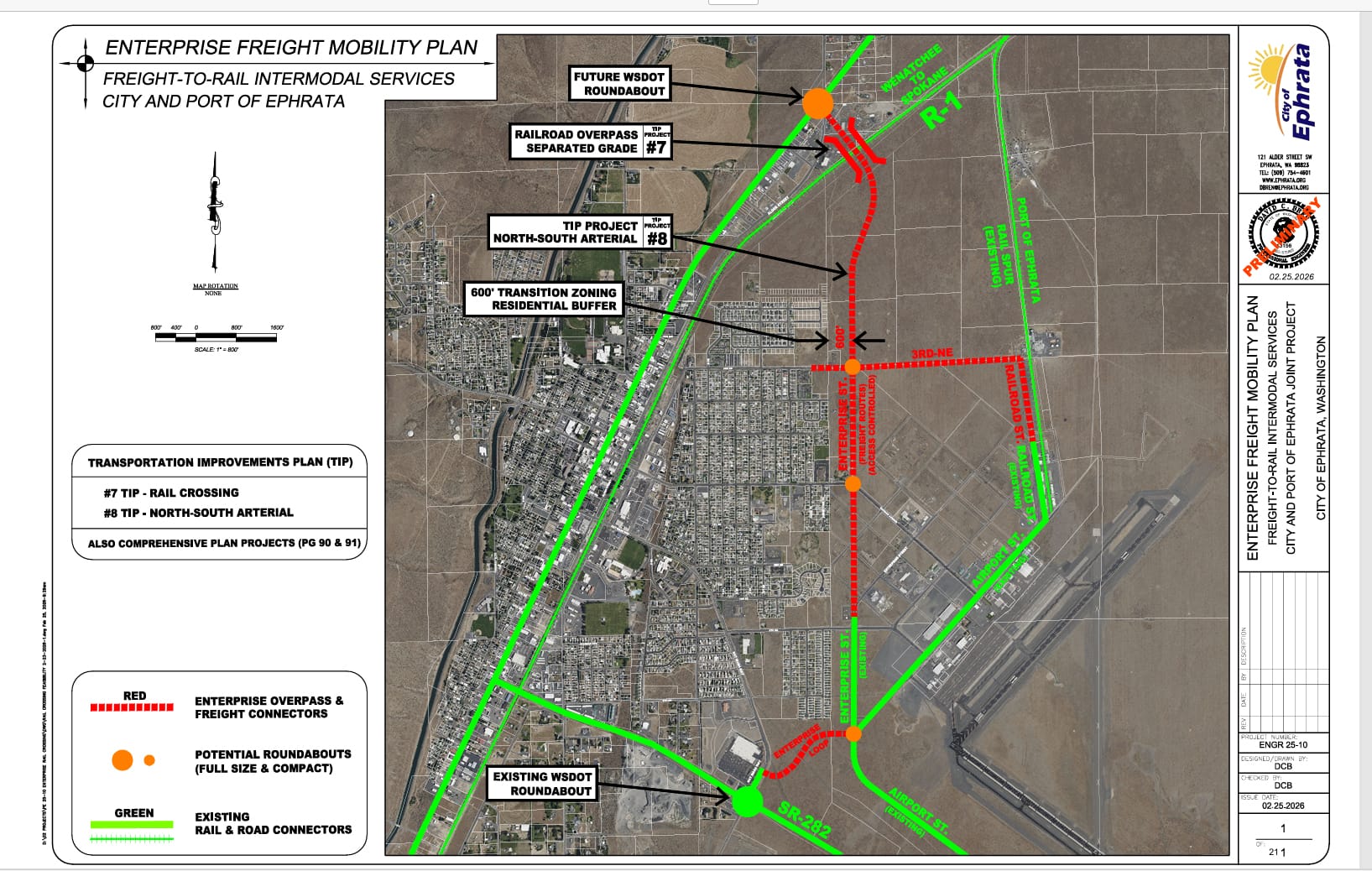 The project’s main focus is to provide direct truck access from SR 28 to the port district, its rail spur, commercial and industrial tenants, and the Ephrata Airport. Currently, that access is limited. Trucks on the highway must enter town and turn onto East Division Avenue, or approach the port from State Route 282 along Nat Washington Way or Airport Street to the south.