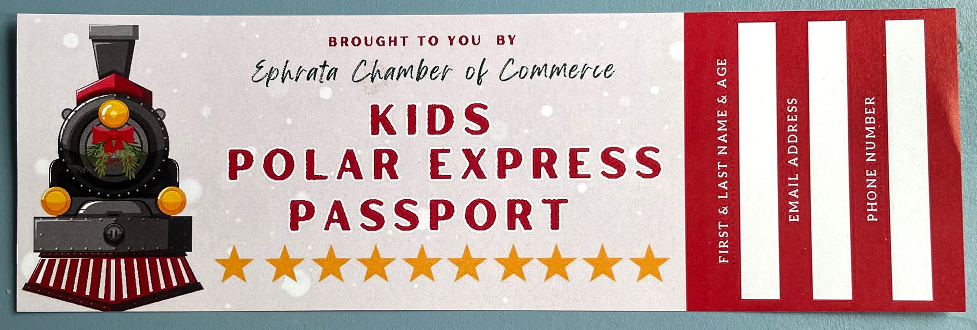 - 9-11:30 a.m. – Kids (and parents) can stop by the Ephrata Chamber of Commerce office at 61 Basin St. N.W. to pick up a “Polar Express Passport,” then follow the map to designated businesses for holiday surprises.