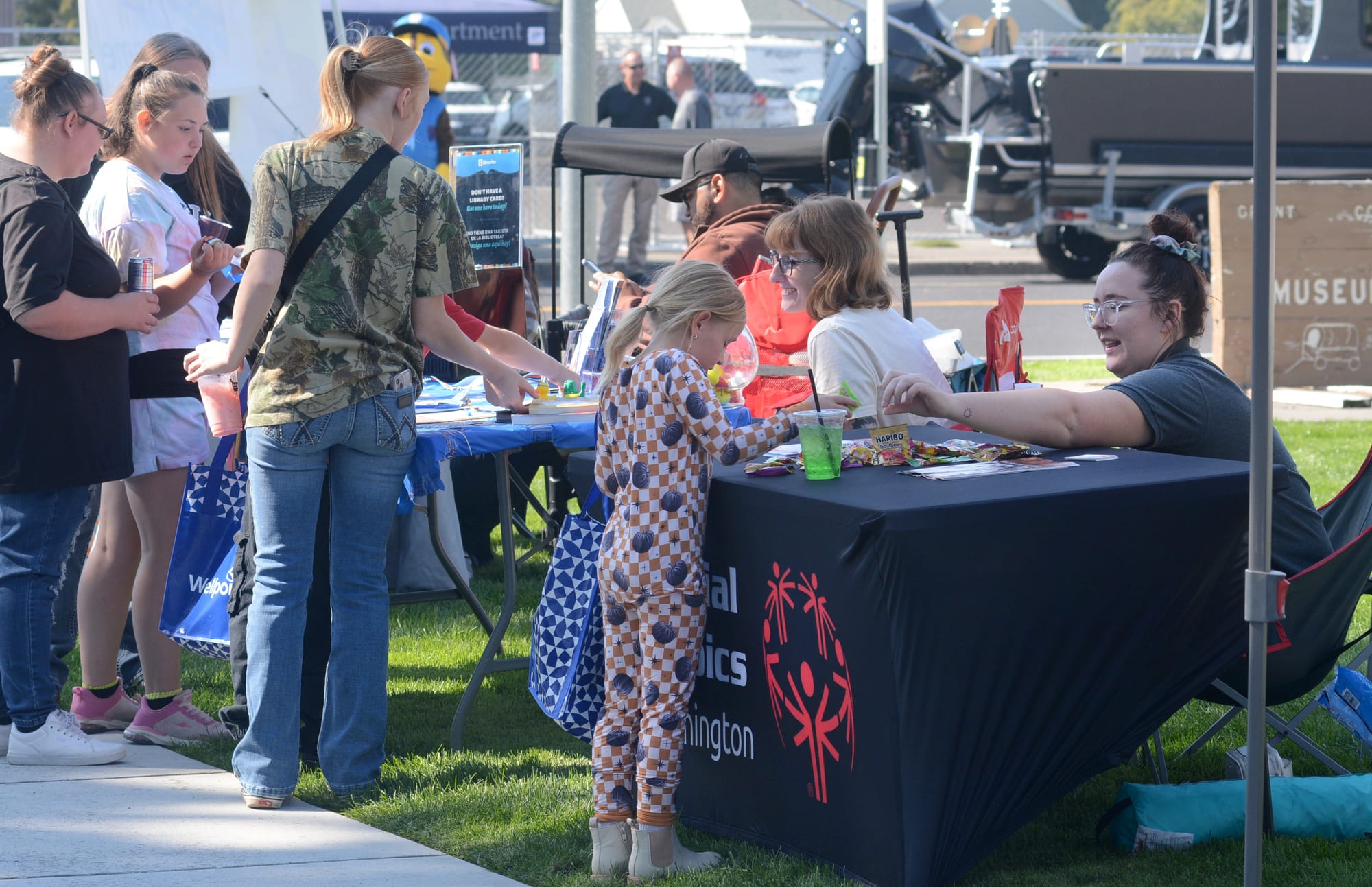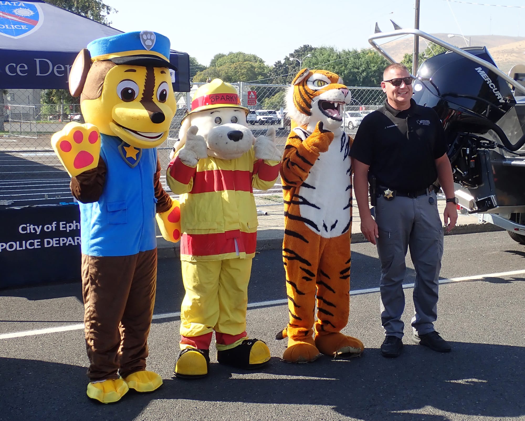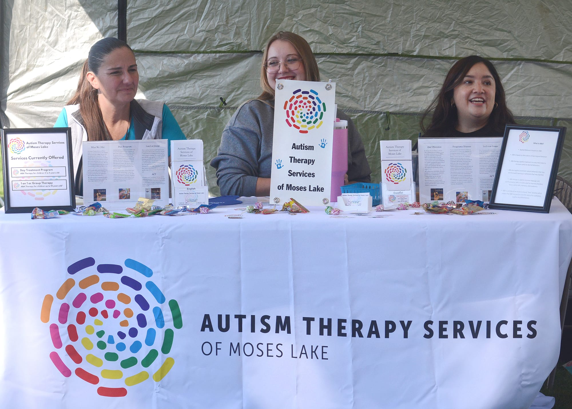 A good crowd from around the Columbia Basin turned out Saturday to enjoy a variety of activities and learn about available resources for families during the annual Autism Acceptance Community Day. The free family-oriented event at the courthouse in Ephrata was sponsored by Autism Support Group of Grant County. Photos by Randy Bracht3-year-old Luna Moe of Moses Lake waved to friends while enjoying a horseback ride provided by the Grant County Sheriff’s Posse. Other fun stuff for kids included a variety of games, arts, and …… the always popular inflatable “bouncy houses.”Aundrea Contreras, left, was (briefly) dismayed when Brandon McCord toppled their stack of wooden construction blocks. The two teens are members of the Ephrata High School Honor Society and were among many volunteers helping out during the day. Autism resource and wellness vendors were on hand to provide information about available services to the public.Local firefighters, EMTs, and law enforcement had their equipment on display for kids and adults alike to explore. The first responders’ mascots added to the festivities, posing here for photos with chief deputy Josh Sainsbury of the Grant County Sheriff’s Office. The ubiquitous Ephrata Tigers mascot also huddled up with Sharon Scellick (left), Tracy Thomas, and Donna McNeil for snapshots. Along with the courthouse activities, an optional self-guided hike to the Autism Ribbon on Beasley Hill was also featured.