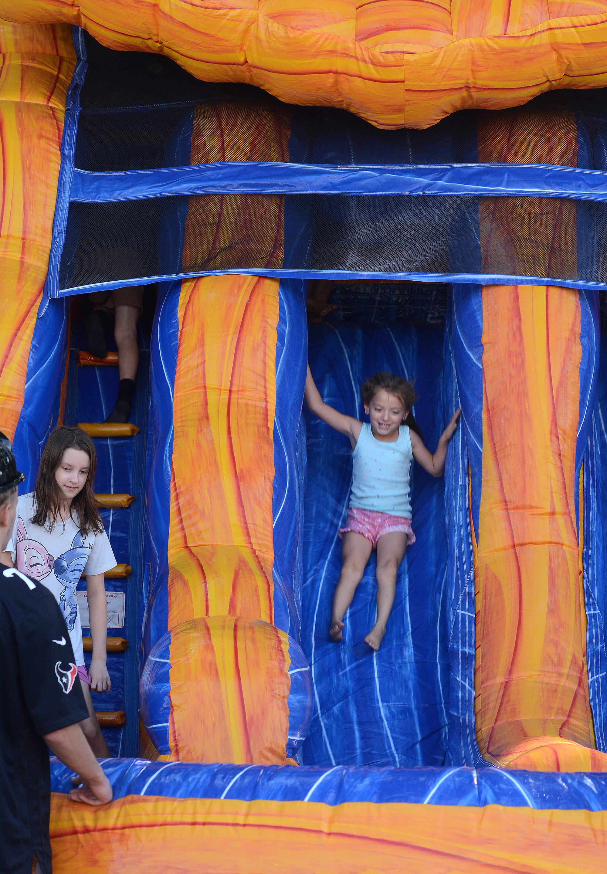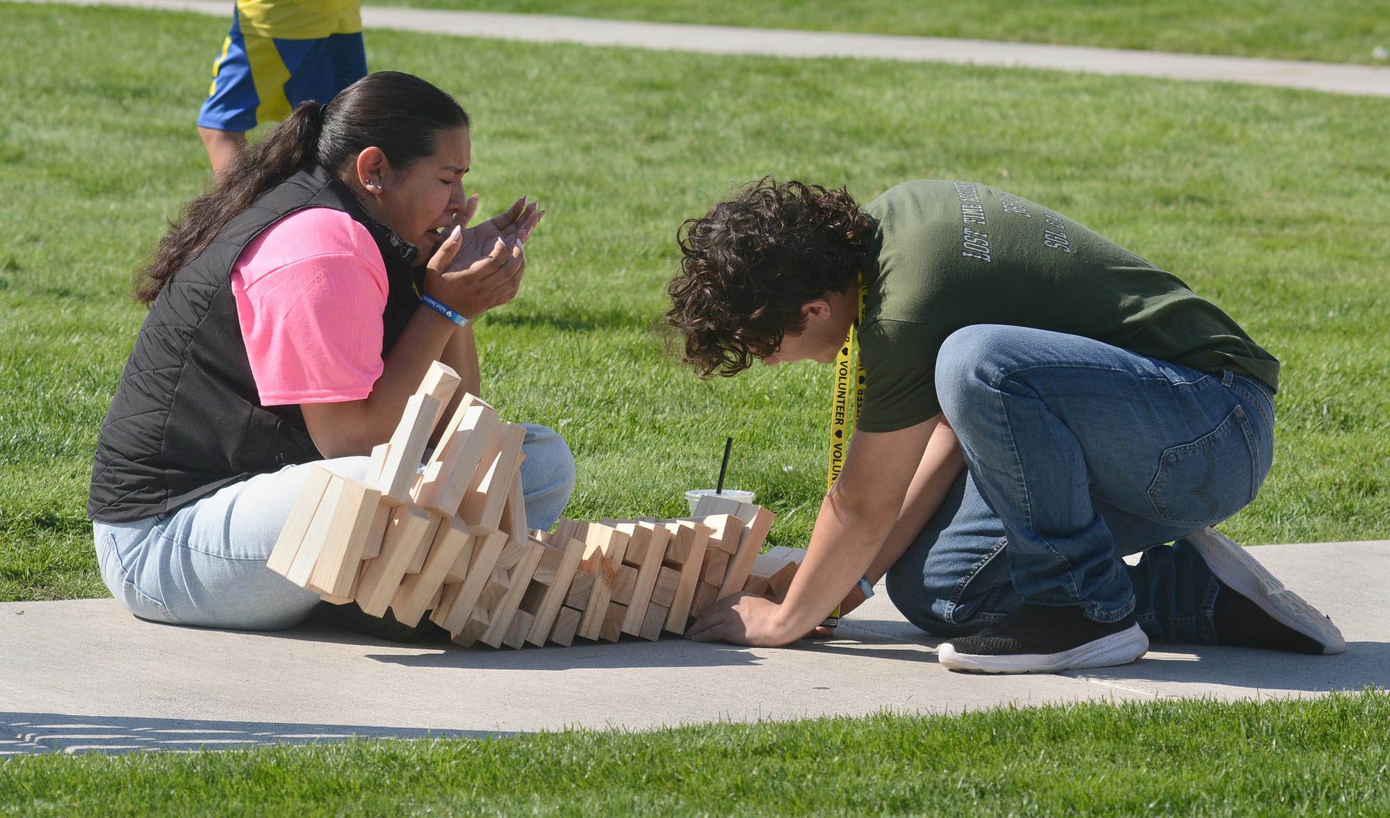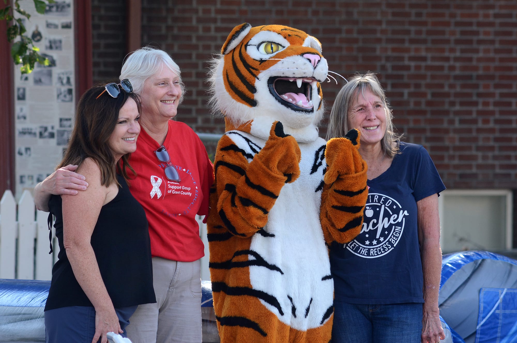 A good crowd from around the Columbia Basin turned out Saturday to enjoy a variety of activities and learn about available resources for families during the annual Autism Acceptance Community Day. The free family-oriented event at the courthouse in Ephrata was sponsored by Autism Support Group of Grant County. Photos by Randy Bracht3-year-old Luna Moe of Moses Lake waved to friends while enjoying a horseback ride provided by the Grant County Sheriff’s Posse. Other fun stuff for kids included a variety of games, arts, and …… the always popular inflatable “bouncy houses.”Aundrea Contreras, left, was (briefly) dismayed when Brandon McCord toppled their stack of wooden construction blocks. The two teens are members of the Ephrata High School Honor Society and were among many volunteers helping out during the day. Autism resource and wellness vendors were on hand to provide information about available services to the public.Local firefighters, EMTs, and law enforcement had their equipment on display for kids and adults alike to explore. The first responders’ mascots added to the festivities, posing here for photos with chief deputy Josh Sainsbury of the Grant County Sheriff’s Office. The ubiquitous Ephrata Tigers mascot also huddled up with Sharon Scellick (left), Tracy Thomas, and Donna McNeil for snapshots. Along with the courthouse activities, an optional self-guided hike to the Autism Ribbon on Beasley Hill was also featured.