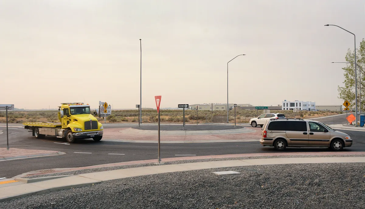 As hoped, the newly constructed roundabout at the intersection of State Route 282 and Nat Washington Way in Ephrata opened for through traffic Wednesday morning. Work on the project began in mid-July and is largely wrapped up about 10 days ahead of schedule. That's a welcome bonus to both local drivers and commuter/trucking traffic from Moses Lake who were detoured on a circuitous route into Ephrata. The collaborative project is intended to slow highway speeds at the intersection and increase safe access to Grant County's new jail facility (visible in the distance) that is expected to open next spring, along with other pending developments in the area. Photo by Randy Bracht