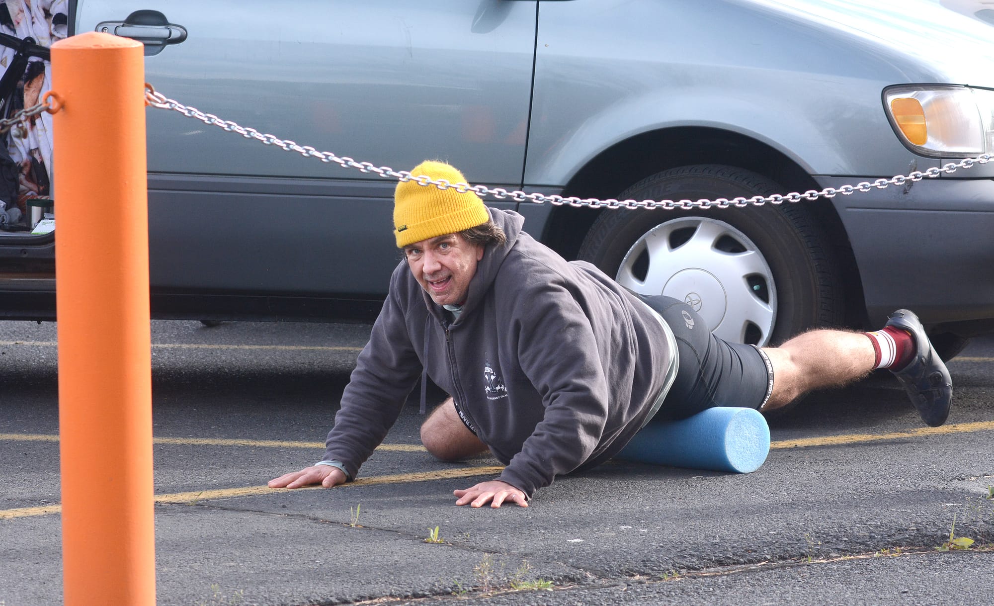 Kevin Maloy, 53, of Seattle, was among the 300-plus entrants who arrived for Sunday’s event. Stretched out in the EHS parking lot, warming up his legs on a foam roller before the start, Maloy said it was his third time participating in the Ephrata ride.