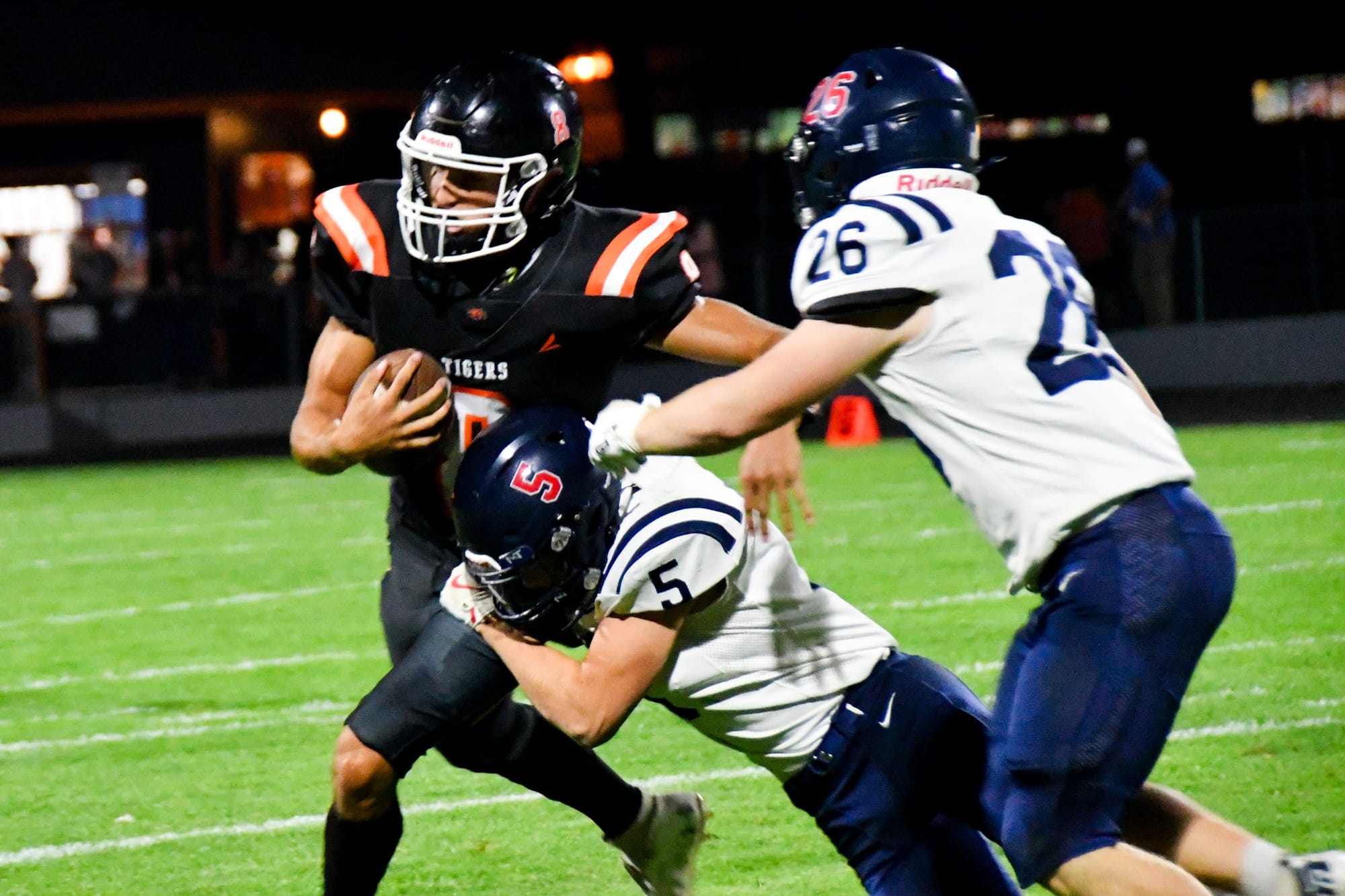 Tiger quarterback Brady Hendrick keyed the offense, running for 141 yards and two touchdowns, and completing eight-of-12 passes for 63 yards and two more TDs.