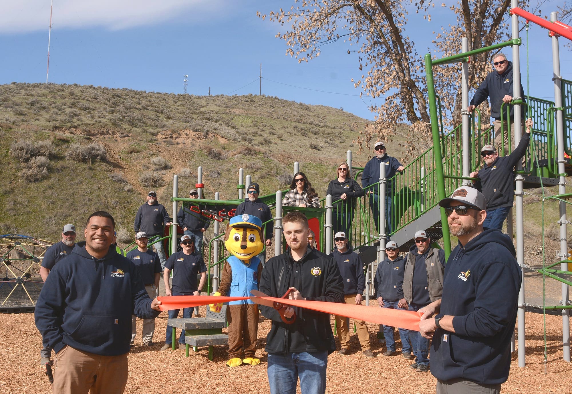 EPHRATA — Wielding an outsized pair of scissors, Ephrata parks and recreation director Josh Johnson snipped a red ribbon dedicating the addition of new playground equipment at Lions Park during a brief ceremony that was cheered by city staff and public works employees Friday morning.
