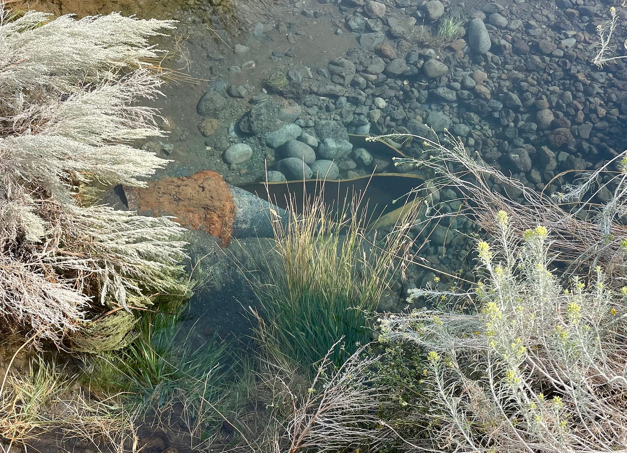 The faulty main was located in an area overgrown by sagebrush and tall grasses — difficult to find in the dark. Rapidly flowing water continued into the irrigation canal after displacing surrounding dirt and rocks, exposing the breached pipe. The pipe itself travels beneath the canal in an eastward direction. The extent of damage was not immediately assessed.