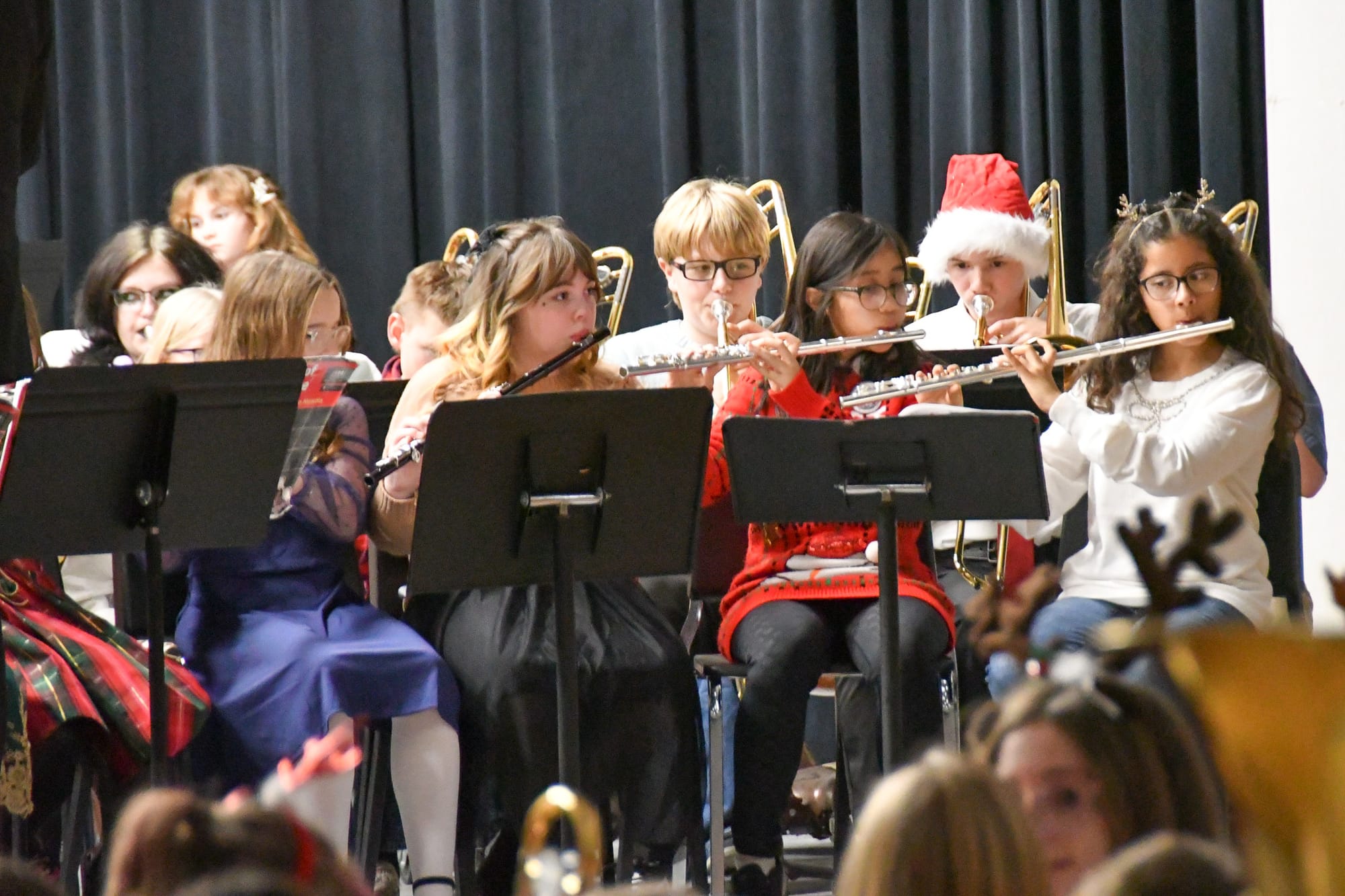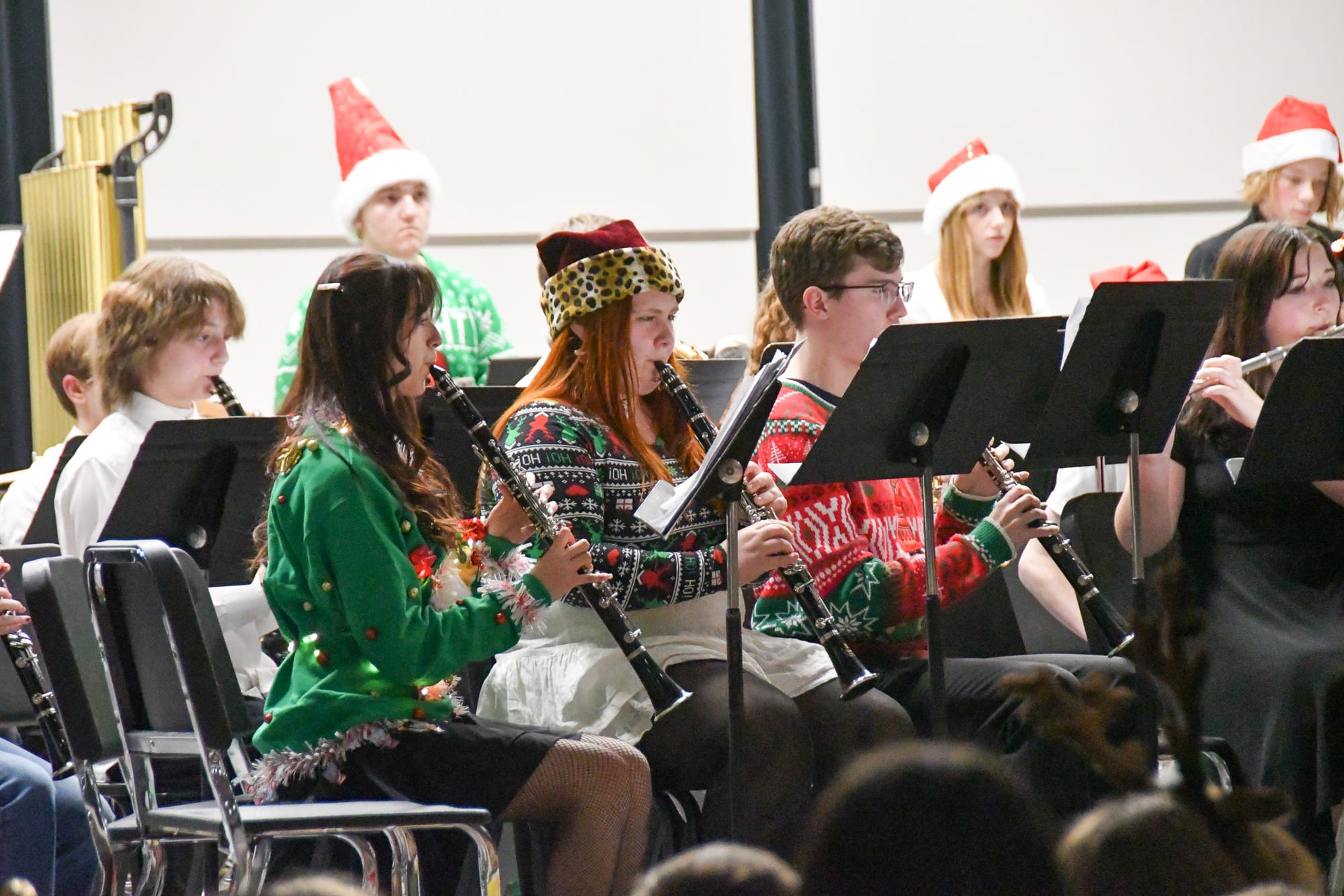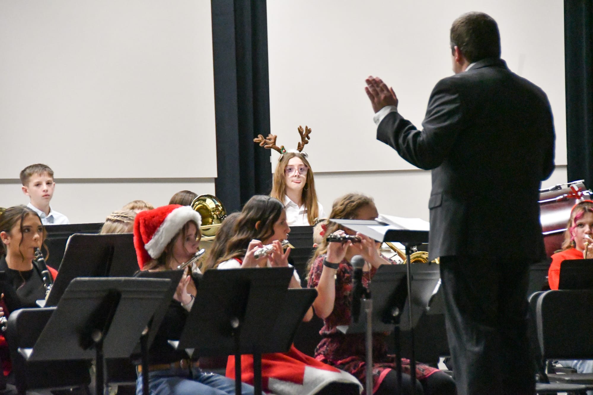 The EMS 7th grade band performed "Rudolph the Red-Nosed Reindeer," followed by the combined middle school band playing "Attack of the Cyclops" and "Antagonist." The 8th grade band brought holiday cheer with "Feliz Navidad" and "I Want a Hippopotamus for Christmas."